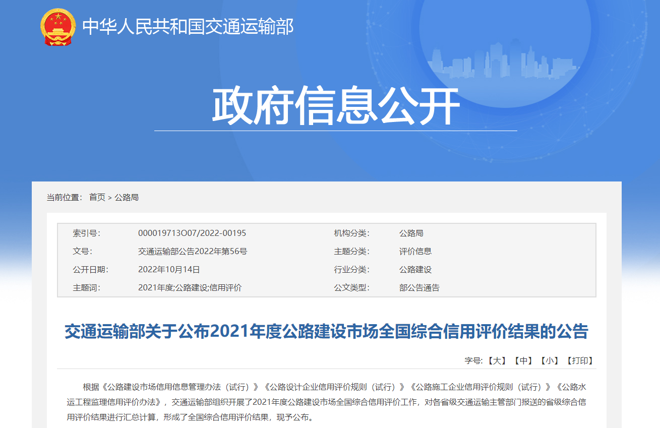 交通運輸部關于公布2021年度公路建設市場全國綜合信用評價結果的公告